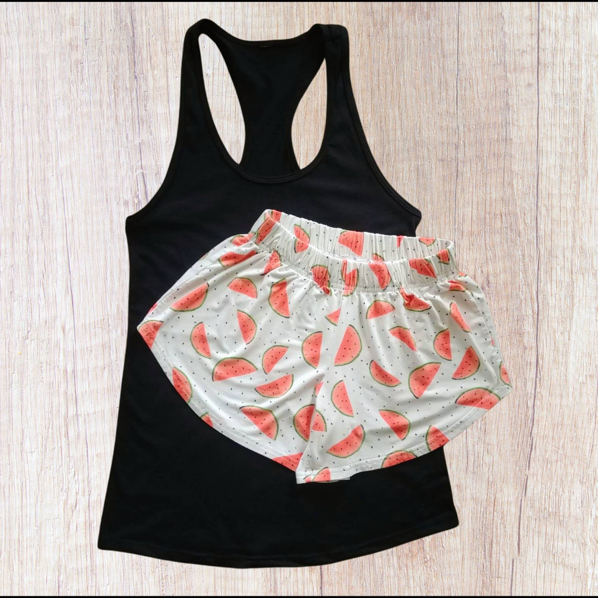 *Watermelon print on an Ivory background with black seeds paired with a Black tank top