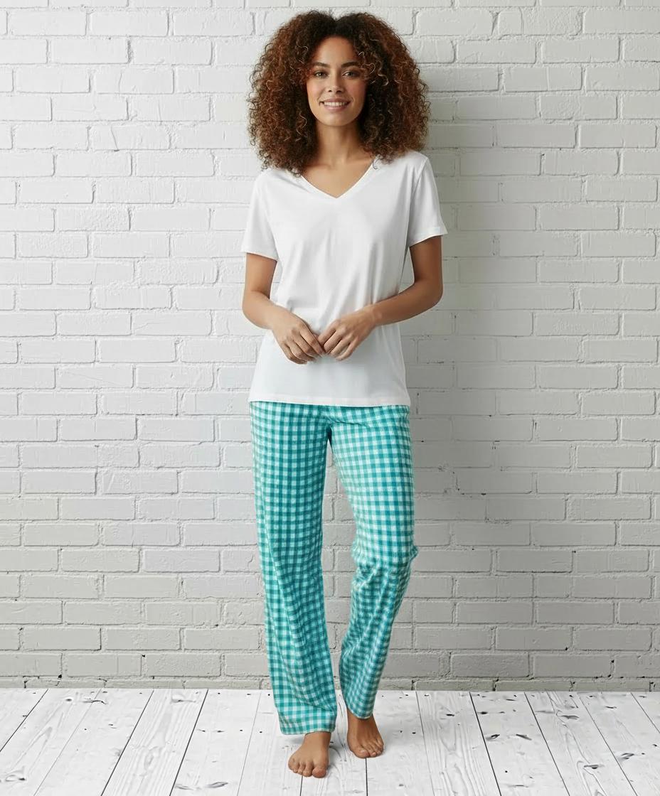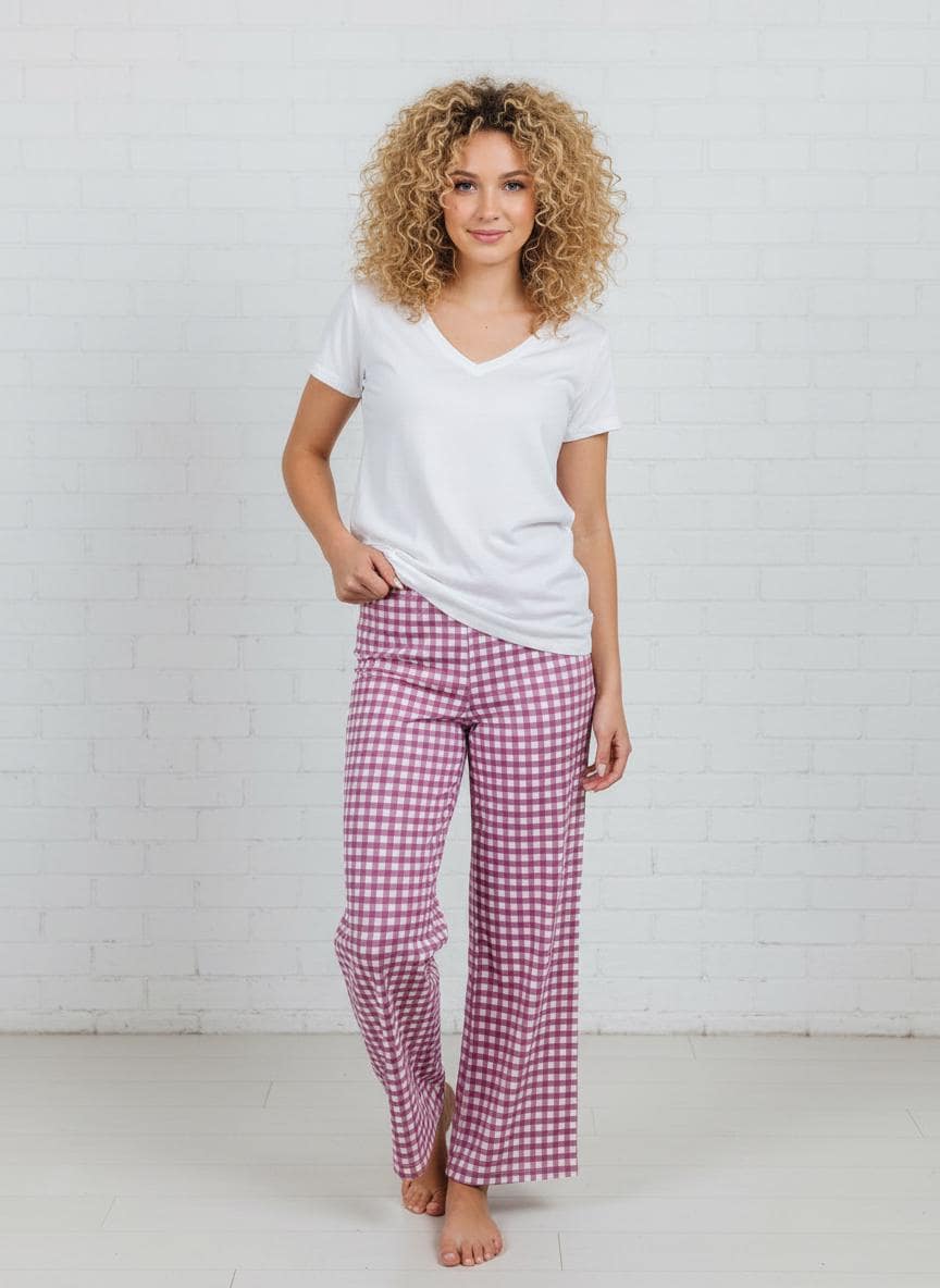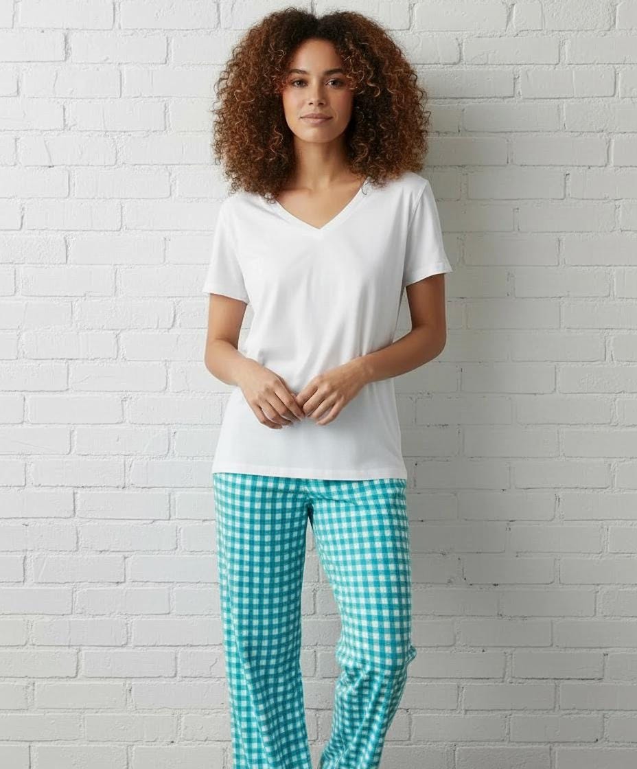 These Organic cotton women's pajamas make perfect gifts for Mom. Women's Pajama Set made out of organic cotton. A super soft v neck tee is paired with a semi fitted wide leg pajama pants to make comfy womens sleepwear Perfect loungewear for staying at home. Pajama Pants feature a soft knit waistband and have a 31" inseam.