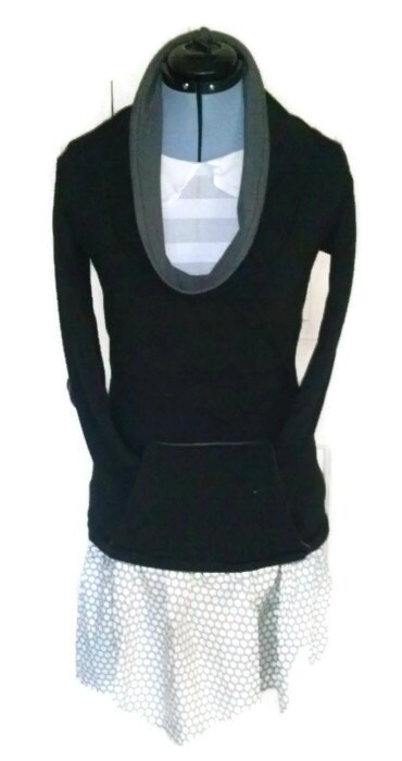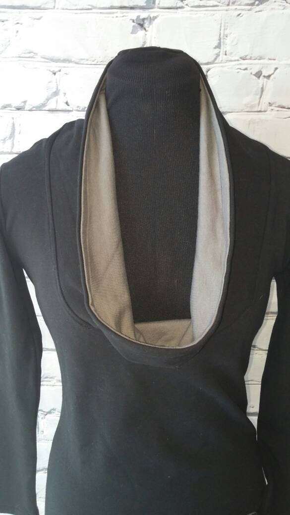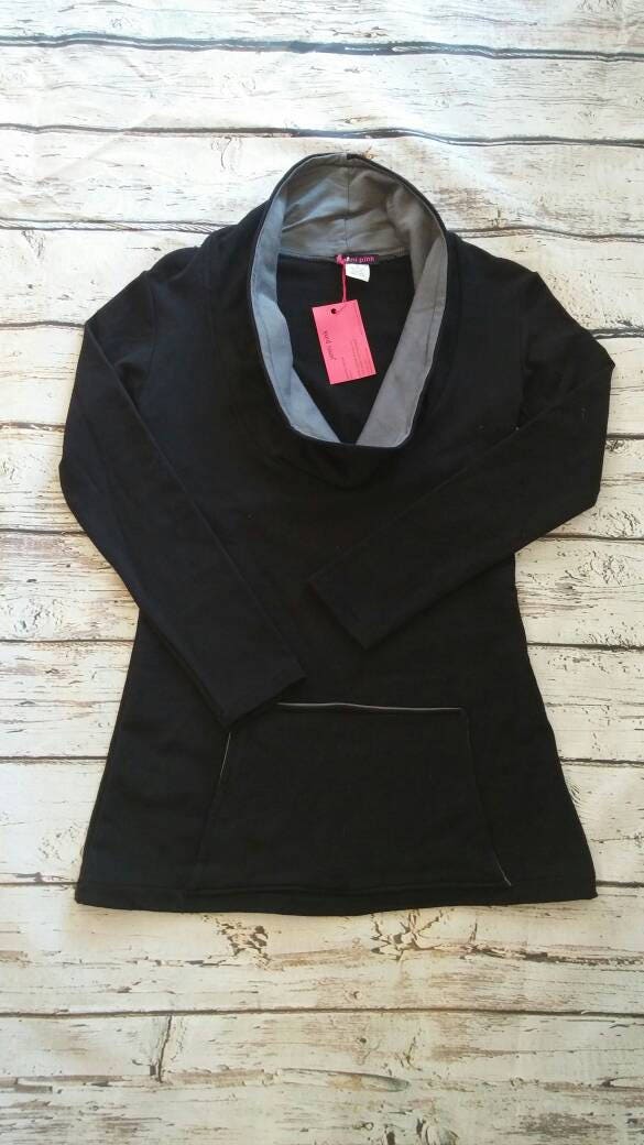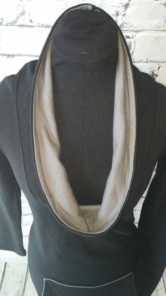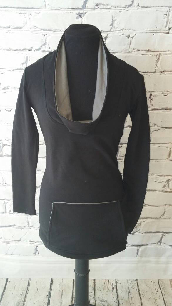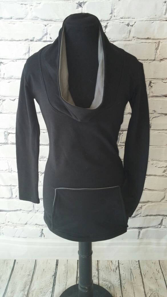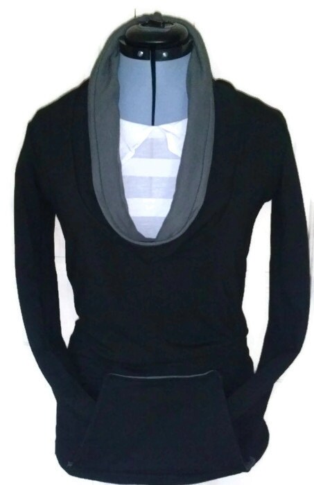 Contrasting Gray sweatshirt fabric lines the inside of the cowl neck and the front pocket. the cowl neck collar can be worn folder over to expose to contrasting inner layer.