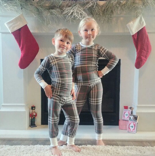 *Adorable Matching Christmas Pajamas. Sizes 3m to 12y. Gray Ivory and Red large scale Plaid Holiday Children's Pajamas are made out of super soft and buttery Cotton/Spandex lightweight knit fabric with 5% stretch.